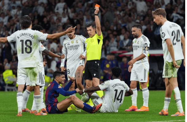 胜负之外,比赛尾声的大冲突却让火药味彻底弥漫。第90+10分钟,佩德里趟球过大后铲倒琼阿梅尼,累计两黄被罚出场,成为冲突的导火索。终场哨响后,替补席附近率先爆发对峙。被换下的维尼修斯、皇马门将卢宁与巴萨的费兰・托雷斯、巴尔德等人陷入争执,随后更多球员与工作人员卷入混战,最终需警察介入才平息局势。